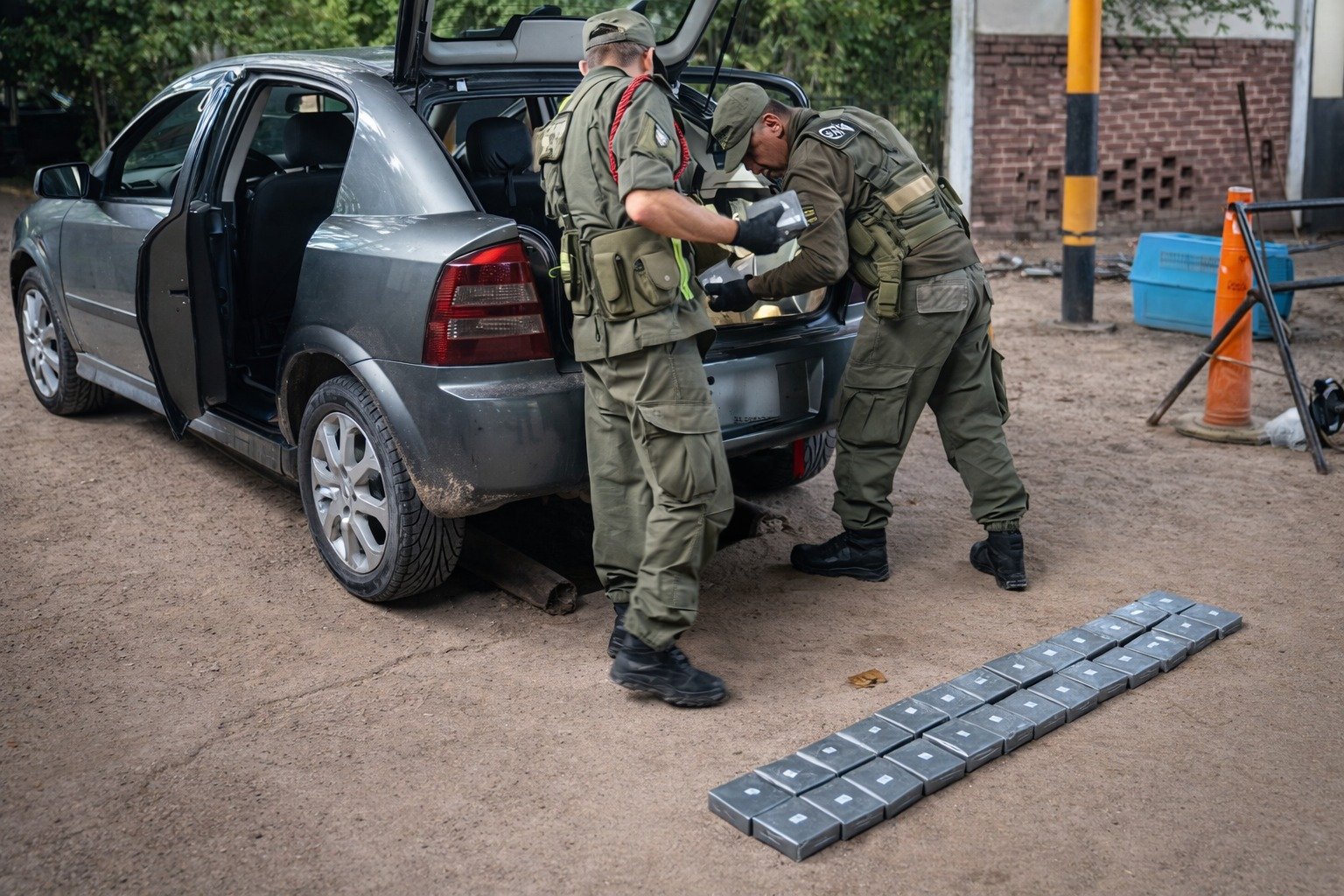 Según se informó, al retirar la chapa que recubría los laterales del baúl encontraron un doble fondo donde estaban escondidos los ladrillos con la droga. Las pruebas posteriores confirmaron que se trataba de cocaína y el peso total del cargamento fue de 23 kilos con 310 gramos.